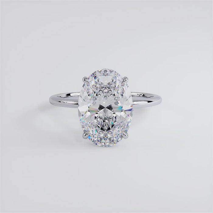 A classic petite wire basket diamond solitaire engagement ring set with 5 Carat Oval Cut Lab Grown Diamond.