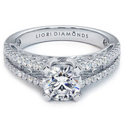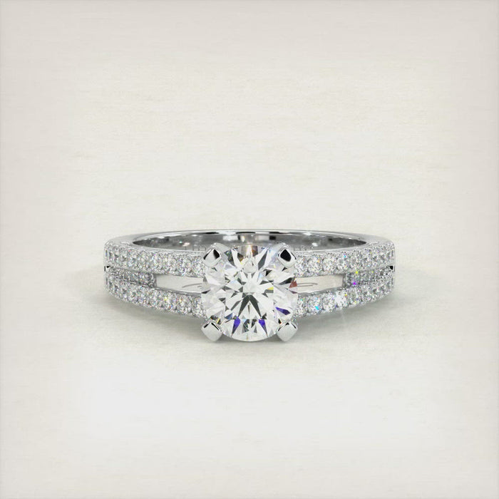 Smashingly centered is a beautiful 1.01 ctw F-SI2 round brilliant diamond. Exposing it's brilliance within a split shank setting, the center diamond is accompanied by 0.43 ctw F-VS round micro pave set diamonds. This beautiful 18k white gold engagement ring also features diamond lined prongs and intricate scroll work on the gallery.