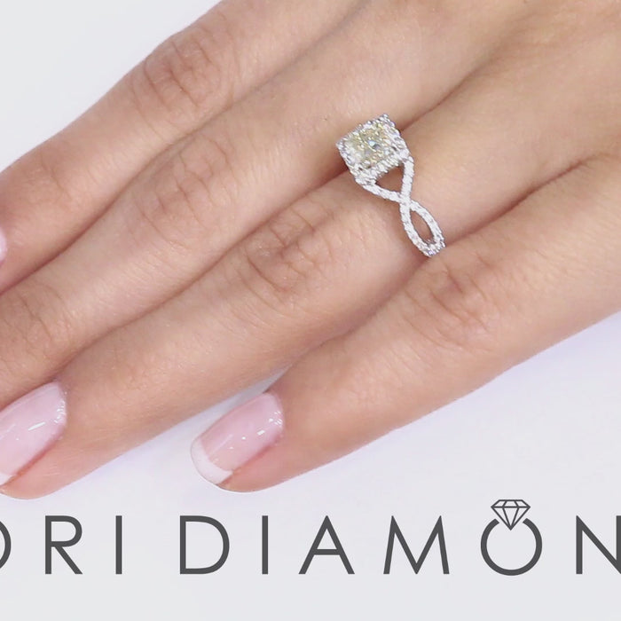 A Princess cut diamond is perfectly centered in a stunning setting. The Princess cut diamond is a total of 0.83 in carat weight with an eye clean J- VS1 calrity. Slightly elevated, the diamond is surrounded by a halo giving it a picturesque look. The crisscross setting is beautifully decorated with 0.65ctw F-VS Round diamonds. The magnificent ring is made in 18k white gold.