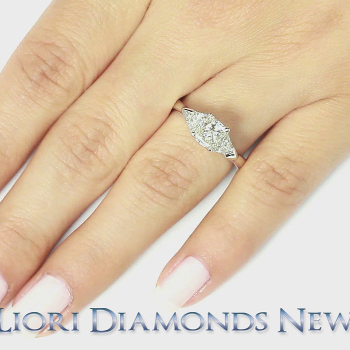 This unique three stone diamond engagement ring holds a 1.00 ctw radiant cut center diamond, and two trillion cut side diamonds totaling 0.70 ctw. All three diamonds are secured in a prong setting. This engagement ring is made in 14k white gold.