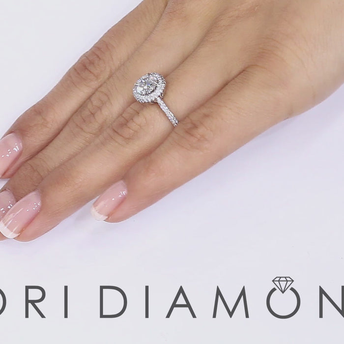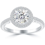 This classic vintage style round diamond halo engagement ring is elegantly set with a 1.20 ctw round brilliant center diamond. Secured by 4 sturdy prongs, the main diamond is E in color, which is colorless, and SI1 in clarity. Micro pave set round diamonds form a beautiful glittery halo around the larger stone, and travel onto the elegant band. Set lavishly in platinum, all pristine side diamonds in this piece are F-VS in color and clarity, and total 0.55 ctw.