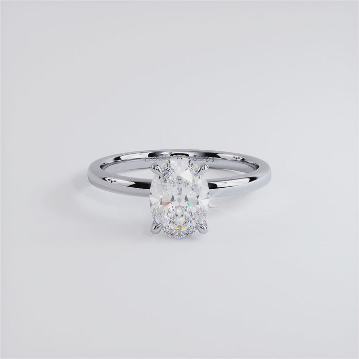 A classic petite wire diamond solitaire engagement ring set with 1.5 Carat Oval Cut Lab Grown Diamond.