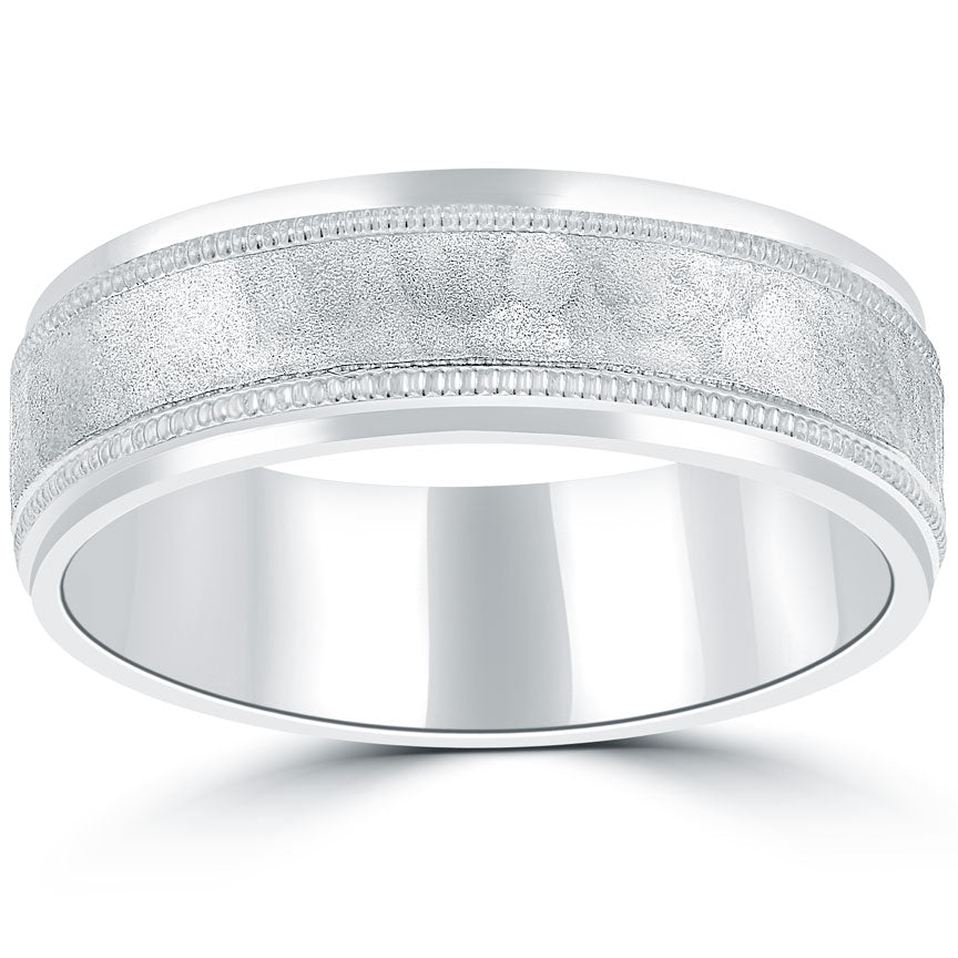Hammered Milgrain Finish Wedding Band Ring 14k White Gold Comfort Fit (7 mm)