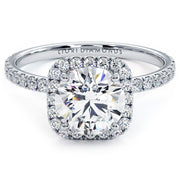A petite squarish halo micropavé diamond engagement ring set with 1.50ct dew Round cut VVS & Colorless (D-E-F) Moissanite.