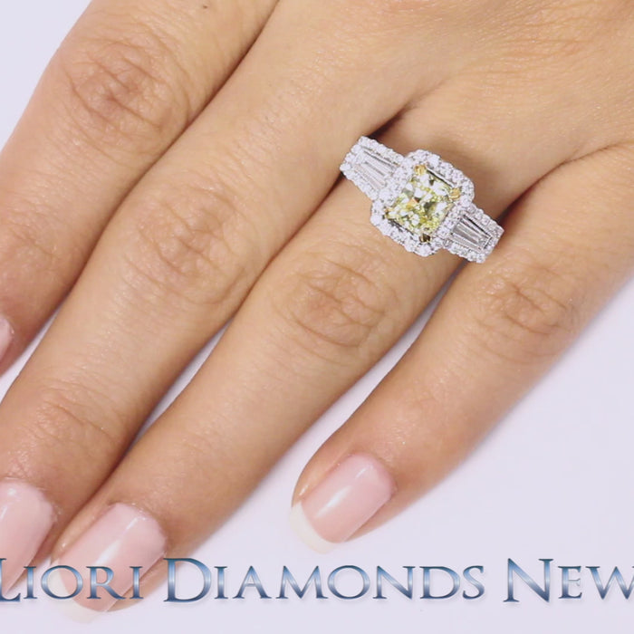 This ravishing Fancy Color Diamond Engagement Ring is set with a 1.18ctw Cushion Cut Natural Fancy Yellow center diamond. The side stone used in this mounting to create this vintage style design are F-VS white baguette cut and round brilliant diamonds. One baguette cut diamond is set horizontally on either side of the center diamond. Round brilliant white diamonds are set in a pave halo design around the center diamond and two baguette cut diamonds. Four yellow gold prongs securely set the fancy yellow center diamond in a prong setting. All of the side diamonds are set in a micro pave setting. This fancy yellow diamond engagement ring is made in 14k white gold.