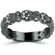 This dazzling wedding band is unique in its style and vintage design. Set with 0.24ctw of F-SI round brilliant diamonds, this wedding band sparkles and shines from every angle. All of the diamonds are set and secured in a micro pave setting. This unique diamond wedding band is made beautifully in 14k black gold.
