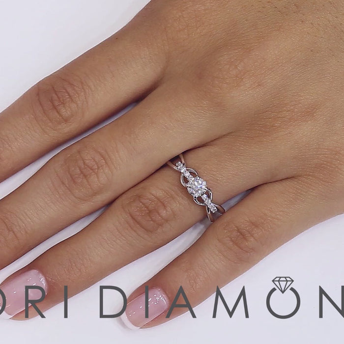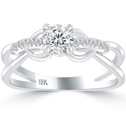 This beautiful engagement ring is crafted in a bow-like setting casted in 18k white gold. Centering the engagement ring is a 0.50ctw D-SI1 Round Brilliant diamond. Securing the diamond are 4 prongs who's outward extensions consist of 012ctw Round diamonds. The engagement ring is a beauty of its own.