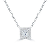 This diamond solitaire necklace is subtle and classy. A captivating 0.50 ctw princess cut diamond of F-VS1 color and clarity sparkles from the center. An additional 0.12 ctw of micro pave set round diamonds create a shimmering halo around the main diamond. Elegant and refined, this necklace is made in 14k white gold.