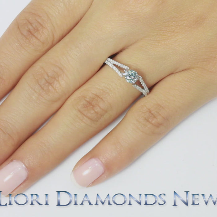 This elegant and classy diamond engagement ring is set with a 0.40 ctw fancy blue round brilliant center diamond and 0.29 ctw of white F-VS round brilliant side diamonds. The fancy blue center diamond is secured in a prong setting. The white round brilliant side diamonds are set in a micro pave setting along the split shank band of this ring. This fancy color diamond engagement ring is made in 18k white gold.
