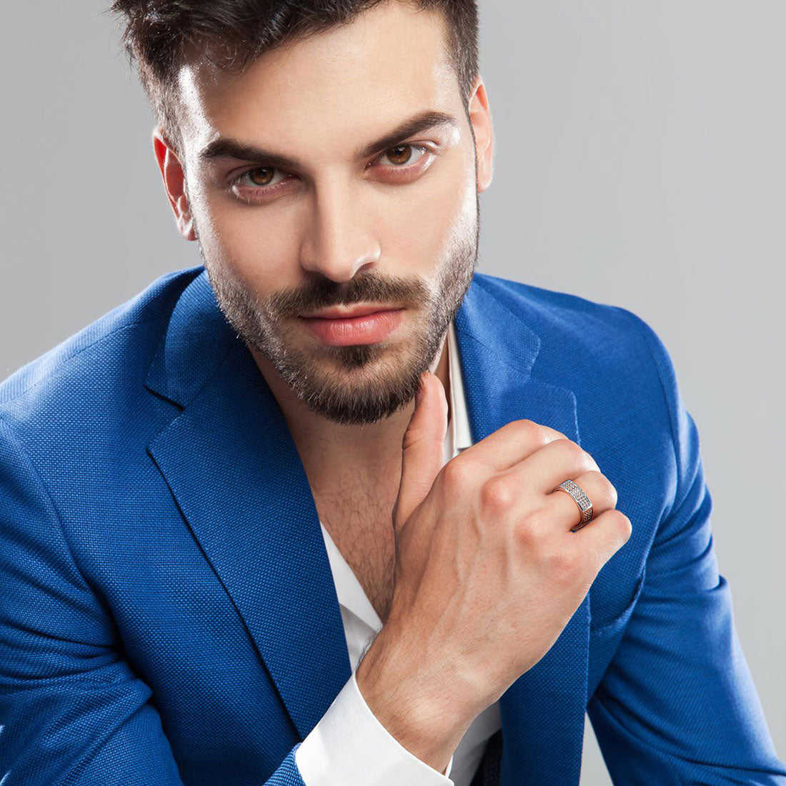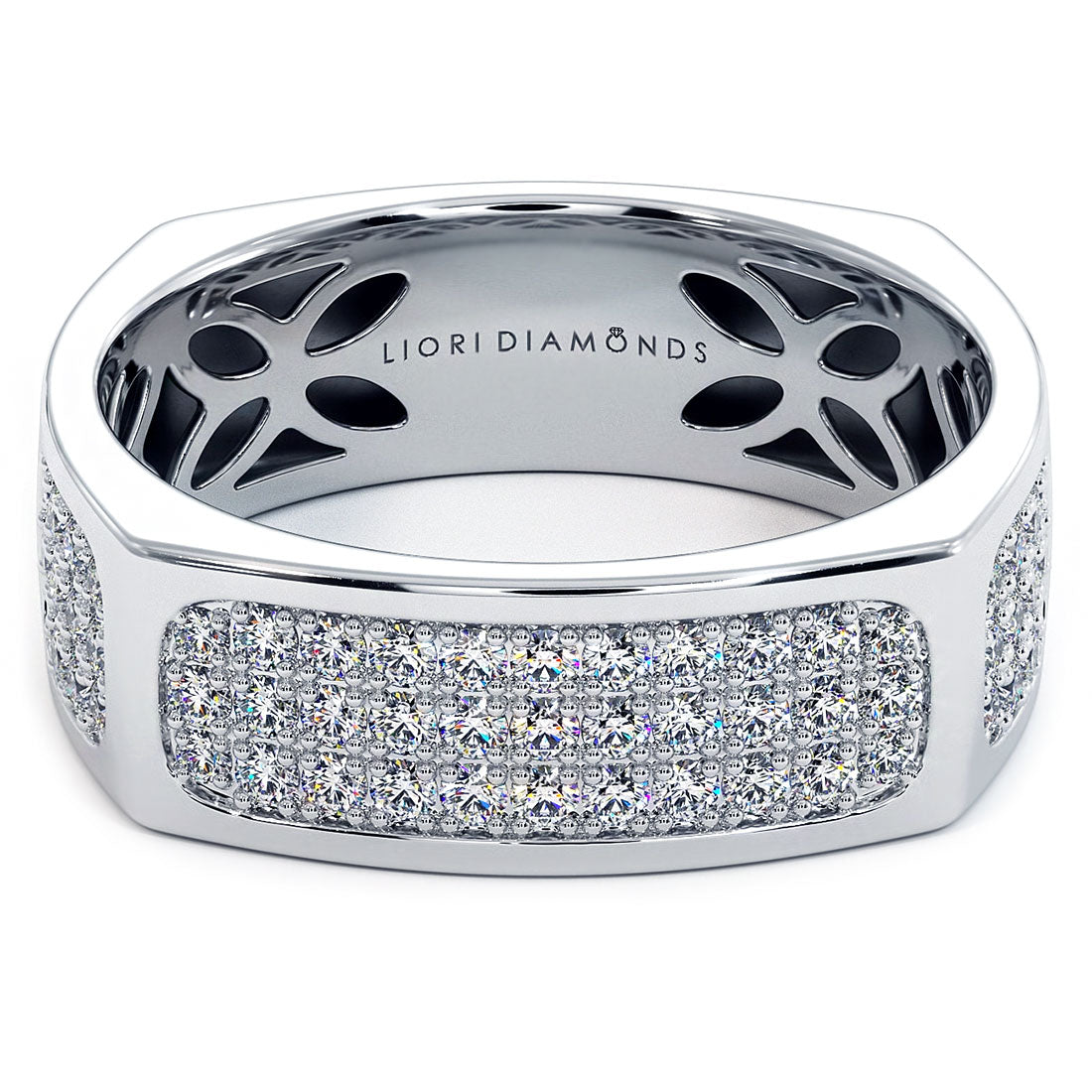 This fiery men's diamond wedding band is set with 1.05ctw of round brilliant D-VVS diamonds. Three rows of round brilliant diamonds are set on the face of the band. Three shorter rows of round brilliant diamonds are set on either side of the band. The band itself is designed in a square shape. This diamond men's wedding band is made in 14k white gold.