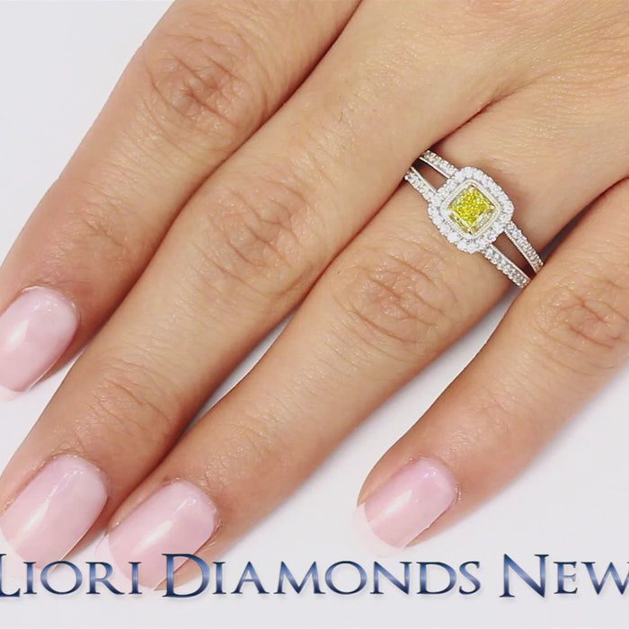 0.75 Carat Fancy Yellow Princess Cut Diamond Engagement Ring 18k Gold Pave Halo