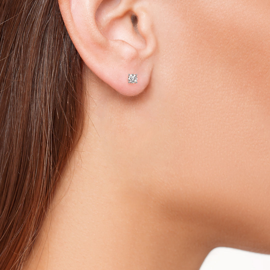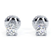 These classic diamond stud earrings allure with their simple yet elegant look. These round diamonds are set in a 14k white gold four-prong basket setting with the screw back closure.