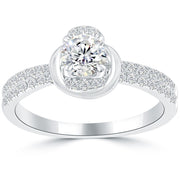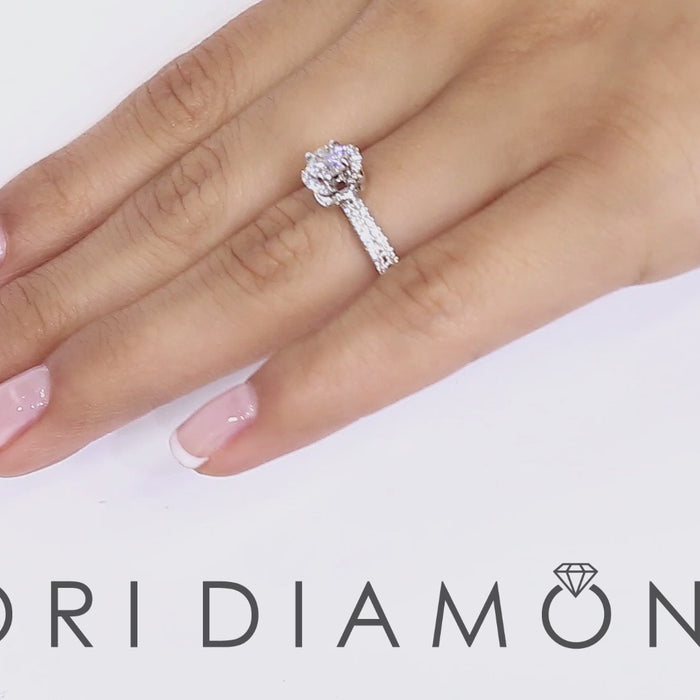 A pretty diamond engagement ring is centered with a 0.54ctw D-SI2 Round Brilliant diamond. The 18k white gold micro pave setting is complimented by 0.30ctw F-VS Rond stones. Classy and demure this beautiful engagement ring is ready for wear!