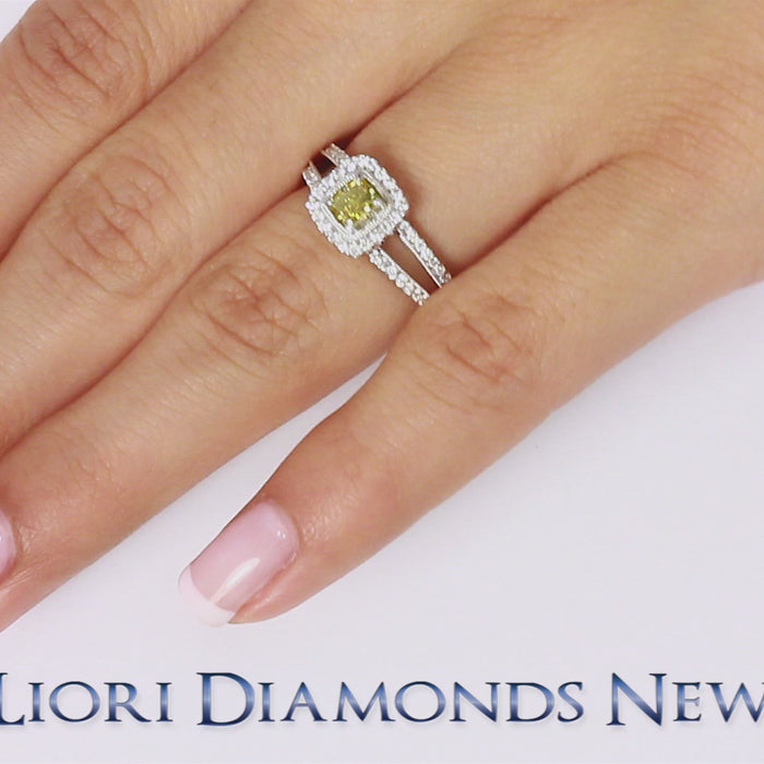0.85 Carat Fancy Yellow Princess Cut Diamond Engagement Ring 18k Gold Pave Halo