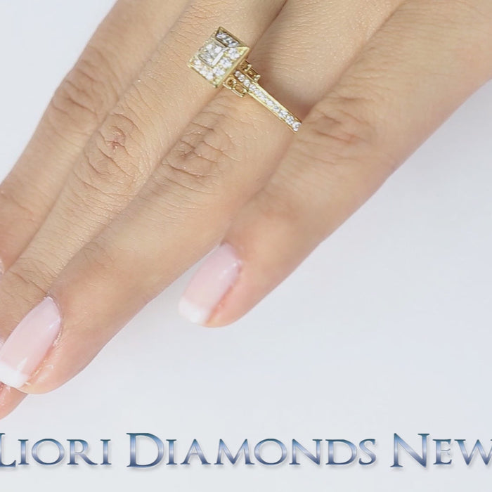 This unique diamond engagement ring is truly a one of a kind stylish ring. The center princess cut diamond is secured in a bezel setting. All of the side diamonds in this mounting are round brilliant cut diamonds. The center diamond stands out very high because of the unique style and design of this ring. Three rows of round brilliant diamonds are set underneath the center diamond, with a gap between each row, creating height. This unique princess cut diamond engagement ring is made in 18k yellow gold.