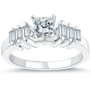 This diamond engagement ring is set with a 0.55ctw princess cut center diamond. This princess cut diamond is an SI1 in clarity making it eye clean, it will show flaws under 10x magnification. This ravishing white princess cut diamond is rated as a D in color which is colorless. The center diamond is accompanied by 0.33 ctw F-VS baguette cut side diamonds; three diamonds on each side. This beautiful diamond ring is made in 14kt white gold.