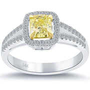 0.95 Carat Fancy Yellow Cushion Cut Diamond Engagement Ring 14k Gold Pave Halo