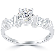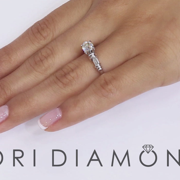 A brilliant round diamond is properly set in a modern chic setting. The 0.75ctw G-SI1 diamond is finely secured by 4 prongs that are slightly elevated. Found on each side of the band is a F-VS Baguette diamond. The sturdy engagement ring is crafted in 14k white gold.