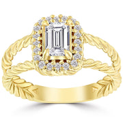 0.96 Carat H-VVS1 Emerald Cut Diamond Engagement Ring 14k Yellow Gold Pave Halo