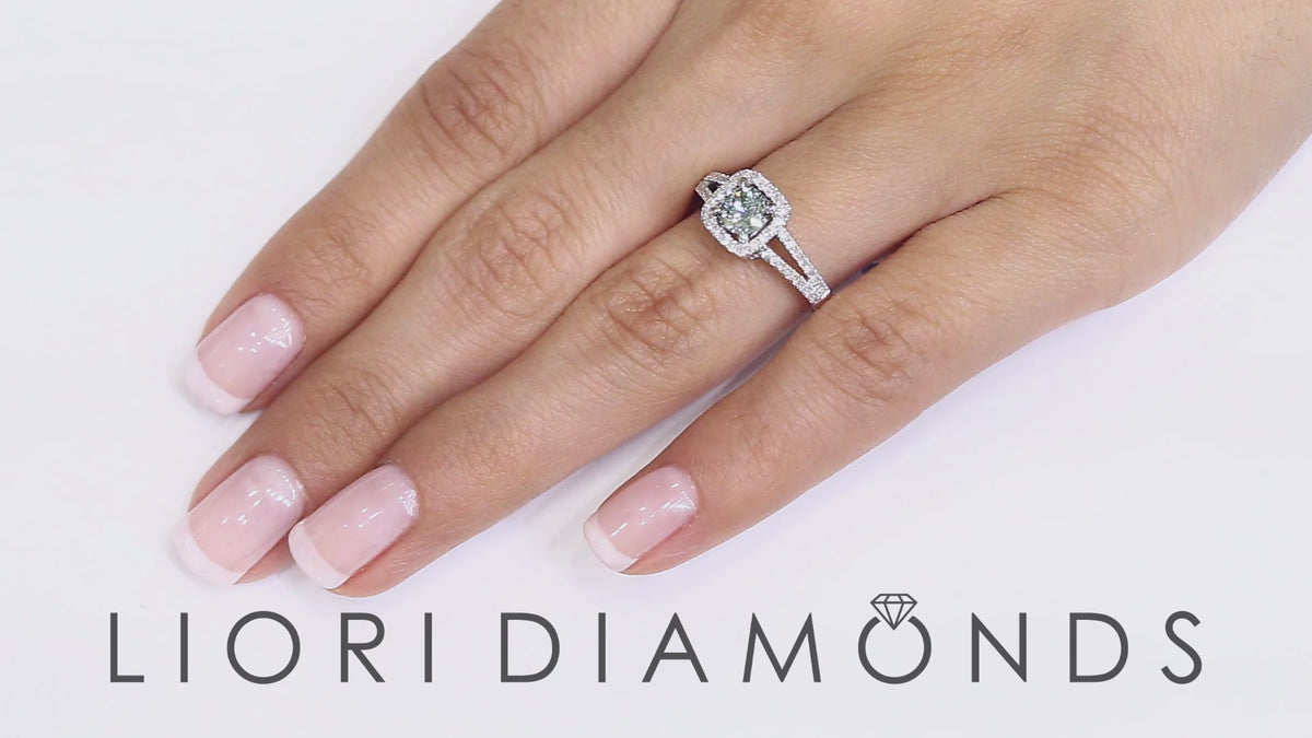 This magnificent vintage inspired fancy color diamond engagement ring is beautifully set with a dazzling 0.62 ctw fancy brilliant round cut blue center diamond. The center diamond is surrounded by a glowing halo of white diamonds, making the blue center stone stand out even more. The elegant split shank band of this ring is lined with F-VS white round brilliant side diamonds that are all set in a micro pave setting. This lovely blue diamond ring is set in 14k white gold.