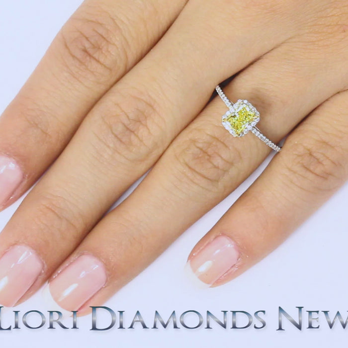 0.99 Carat Fancy Yellow Radiant Cut Diamond Engagement Ring 18k Gold Pave Halo
