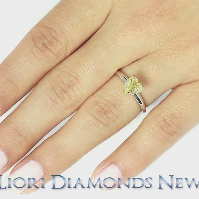 This fancy color heart shaped diamond engagement ring is set in a classic solitaire diamond setting. The 1.02ctw Fancy Yellow heart shaped diamond is full of beauty and sparkle. The fancy yellow diamond is set in a yellow gold base and secured in a prong setting. This fancy yellow solitaire diamond engagement ring is made in 14k white gold.