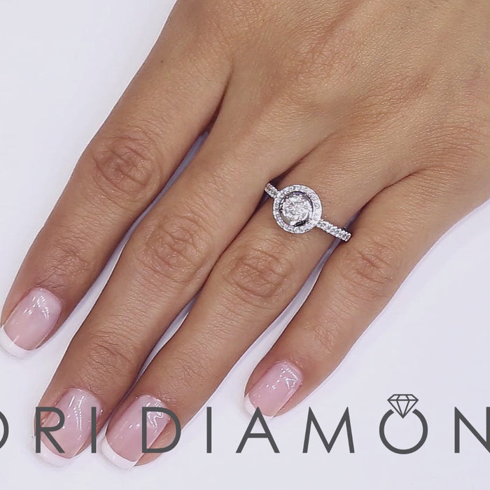 Here is a wonderful engagement ring centered with a 0.50ctw F-I1 Round Diamond. The setting was created in a vintage style with intricate designs just at the base of the circular prong. The micro pave setting consists of 0.52ctw F-VS Round diamonds.The beautiful engagement ring is made in 14k white gold.
