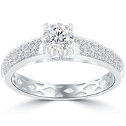 A Dainty Beauty is the Essence of this Engagement Ring with a 0.53ct T.W. Round Brilliant Diamond with an E Color and SI1 Clarity with an Additional 0.50ct T.W. of a Round Brilliant Diamond Accents with F Color and VS Clarity that Extends into the Band's Half Mark and Gallery in 14k White Gold Micro Pave Setting.