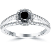 This traditional split shank black diamond engagement ring is perfectly set with a 0.68 ctw round cut black diamond, surrounded by a halo of white diamonds and decorated with 0.37 ctw of round cut white diamonds. This is the perfect black diamond engagement ring for that woman who likes a vintage style black diamond engagement ring. This black diamond ring can be worn on special occasions as well as everyday. All of these diamonds are perfectly set in 18k white gold.