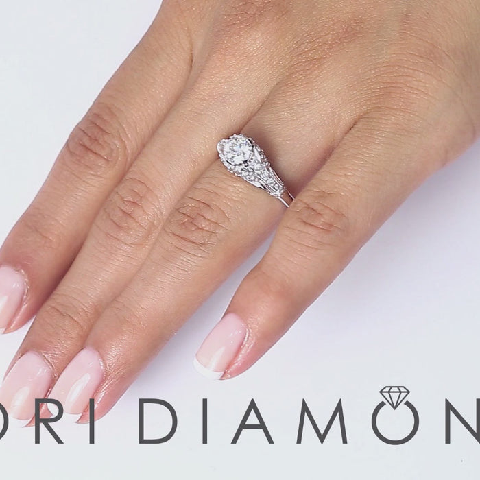 Here is a lovely engagement ring centered with a stunning 0.75ctw Round Brilliant Diamond. Visible inclusions are slightly noted yet remains colorless as it is graded H-SI1. It's Micro pave setting is beautifully crafted in a vintage style complemented by 0.36ctw round diamonds. This crown like engagement ring is made in 14k White Gold.