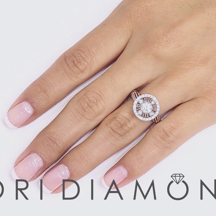 The one-of a-kind engagement ring is centered with a 0.54ctw F-SI1 Round Brilliant Diamond. Secured by 4 prongs, the center diamond is beautifully surrounded by a halo with an elegant base. The ravishing setting is uniquely designed and made in 18k white gold.