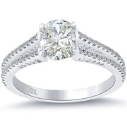 This classy split shank diamond engagement ring is perfectly set up with a 0.91ctw white oval cut diamond center stone and 0.24ctw of gorgeous round diamond side stones. This unique diamond engagement ring is complimented by small round white diamonds on the shank of the ring. This very unique diamond engagement ring is casted in 18kt white gold. The main stone shows minimal visible imperfections under magnification as it is a SI2 in clarity diamond. This is the perfect diamond engagement ring for someone who wants a simple, yet beautiful diamond engagement ring.
