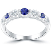 This beautiful vintage style wedding band anniversary ring is elegantly set with 1.15ctw of white round brilliant white diamonds and blue sapphire stones. All of the stones are secured in a prong setting and are set along the top half of the band. This stunning anniversary ring is made in 14k white gold.