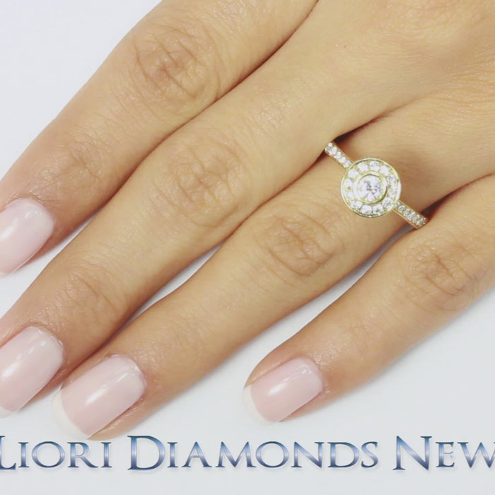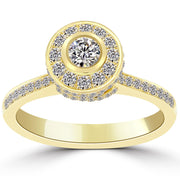This modern stylish Diamond Engagement Ring holds a 0.26ctw Round Brilliant center diamond. The side stones used in this mounting are all F-VS round brilliant diamonds. A halo of micro pave diamonds surrounds the round center diamond. Another row of diamonds wraps the halo of diamonds, from the side view. One row of micro pave diamonds are set on either side of the band, going about half way down the ring. The center stone is raised very high because of the three rows of micro pave diamonds set beneath it. The round center diamond is secured by a bezel type setting. This Diamond Engagement Ring is made in 18kt Yellow Gold.