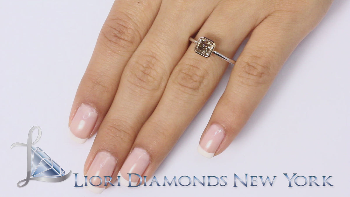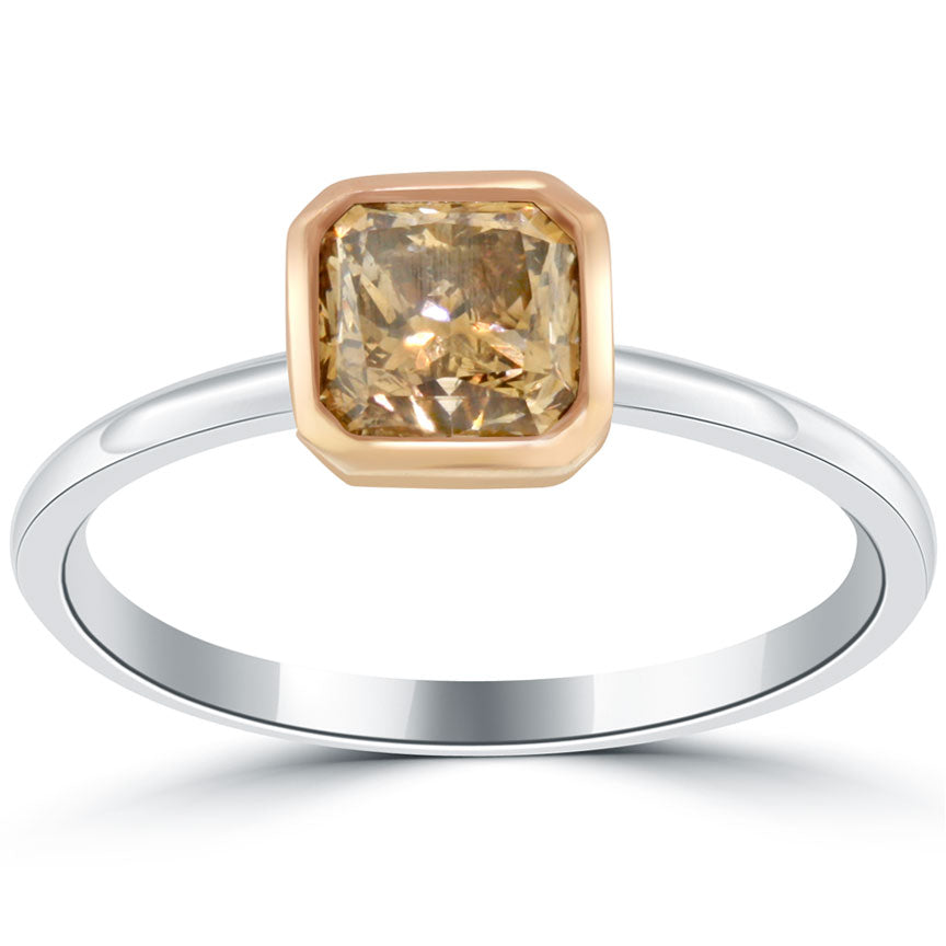 This beautiful classic solitaire engagement ring is set with a 1.18ctw natural fancy chocolate brown radiant cut center diamond. The center diamond is set in a bezel setting. This engagement ring is made in 14kt rose and white gold.