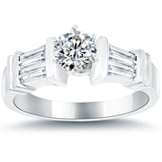 This one of a kind diamond engagement ring is set beautifully with a 0.57 ctw round brilliant center diamond. 0.65 ctw of baguette cut diamonds are set horizontally on either side of the round center diamond in a channel setting. The round center diamond is secured in a prong setting. This beautiful diamond engagement ring is made in 14k white gold.