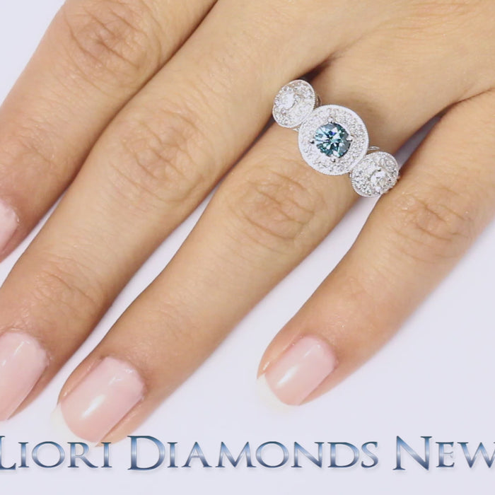 This fancy blue diamond engagement is designed with a unique vintage style. A dazzling 0.52ctw round brilliant fancy blue center diamond is set elegantly in a prong setting in this beautiful ring. 0.72ctw of F-VS round brilliant white side diamonds are set in a micro pave setting in this mounting. Two white round diamonds are set on either side of the main diamond. Smaller white round diamonds surround all three main stones in a pave halo design. This fancy color diamond ring is made in 14k white gold.