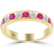 This lovely wedding band anniversary ring is beautifully set with 1.25ctw of white round brilliant white diamonds and genuine ruby stones. All of the stones are secured in a channel setting and are set in a single row along the dazzling band. This elegant anniversary ring is made in 14k yellow gold.
