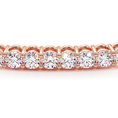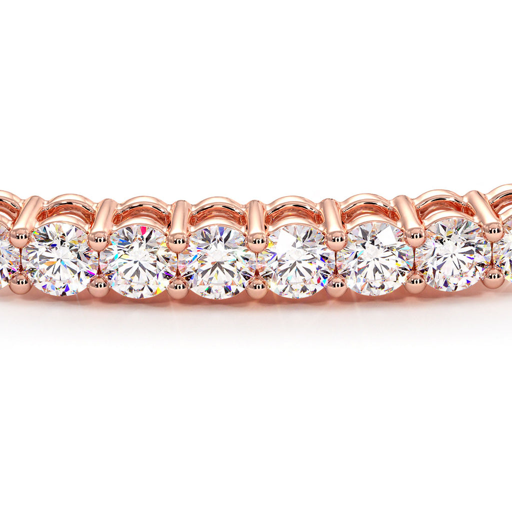 This single row prong set round brilliant cut diamond bangle bracelet is set with F color & VS1 clarity diamonds, every diamond is set beautifully and carefully in a shared prong setting, the double securing clasp allows for worry and stress free wear. This diamond bangle bracelet is made in 14k Rose Gold.