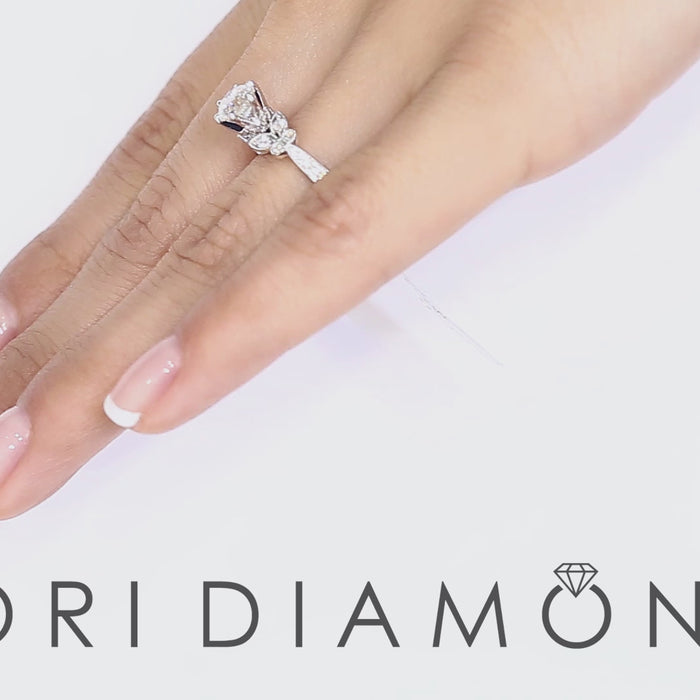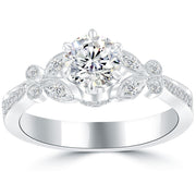 Here is an irresistible fairy-tale like engagement ring. Charmingly centered is a 0.90 ctw F-SI1 Round Brilliant diamond. Securing and holding it at an elevated height are six sturdy prongs. At the base of the prongs are small round diamonds giving the setting a unique feature. The lovely mount is crafted with 0.38 ctw F-VS Round Brilliant diamonds on either side of the artsy band. The 18k white gold engagement ring is ready for wear!