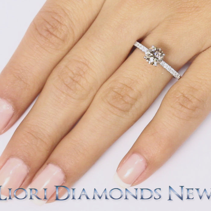 This fancy color diamond engagement ring is set in a very traditional and classic mounting. The 1.00ctw fancy cognac brown round brilliant center diamond is set low and is secured by four accompanying prongs. 0.28ctw of F-VS white round brilliant side diamonds are set in a micro pave setting along the thin elegant band of this ring. This fancy brown diamond ring is made in 18k white gold.