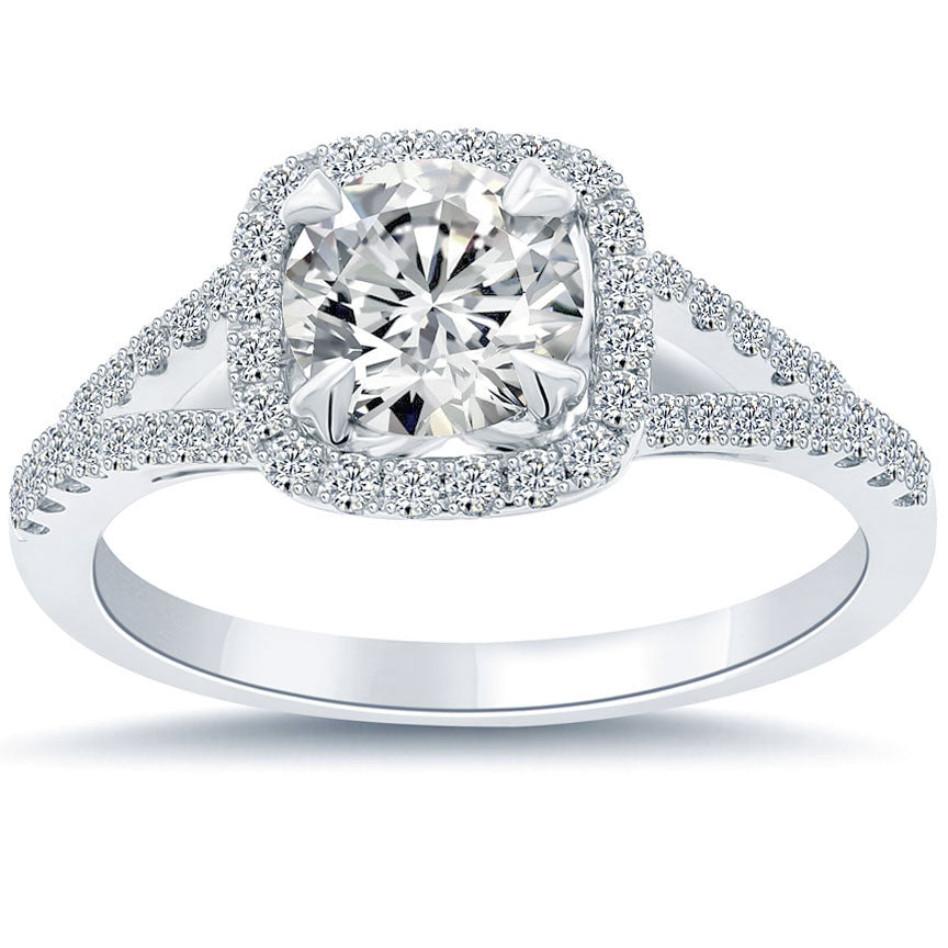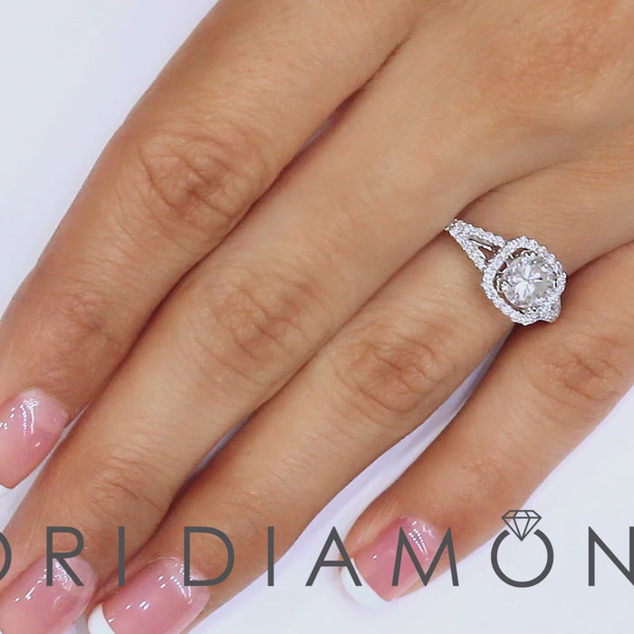 Here is a majestic micro pave setting that is beautifully centered with a timeless 1.02 ctw round brilliant diamond. With a D-SI1 grading, the diamond is colorless and is secured in the setting by 4 sturdy prongs. A total of 0.33 carats of micro pave set diamonds surround the main stone in a halo design to enhance its brilliance, and are also set in the semi split band. This unique diamond engagement ring is crafted in 14k white gold.