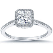 This ladies diamond ring is made with 1.03 ctw F-SI1 Cushion Cut center diamond. One row of micro pave diamonds is set around the center diamond. One row of micro pave diamonds lines up either side of the band and going half way down the ring. The center diamond is secured with a prong setting and the side diamonds are set in a micro pave setting. This diamond ring is made in 18kt White Gold.
