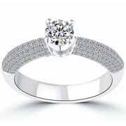 This elegant diamond engagement is set with a 0.46 ctw round brilliant center diamond. The side diamonds used in this engagement ring are all round brilliant diamonds as well. The center round diamond is set in a prong setting and all of the side diamonds are set on the band in a micro pave setting.
