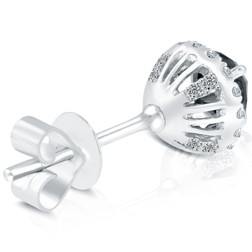 This stylish pair of diamond stud earrings are set with two round brilliant fancy black diamonds. F-VS white round brilliant diamonds are set in a pave halo around the black round diamonds. These black diamond studs come with a white gold securing earring closure. These diamond studs are made in 18k white gold.