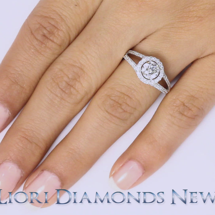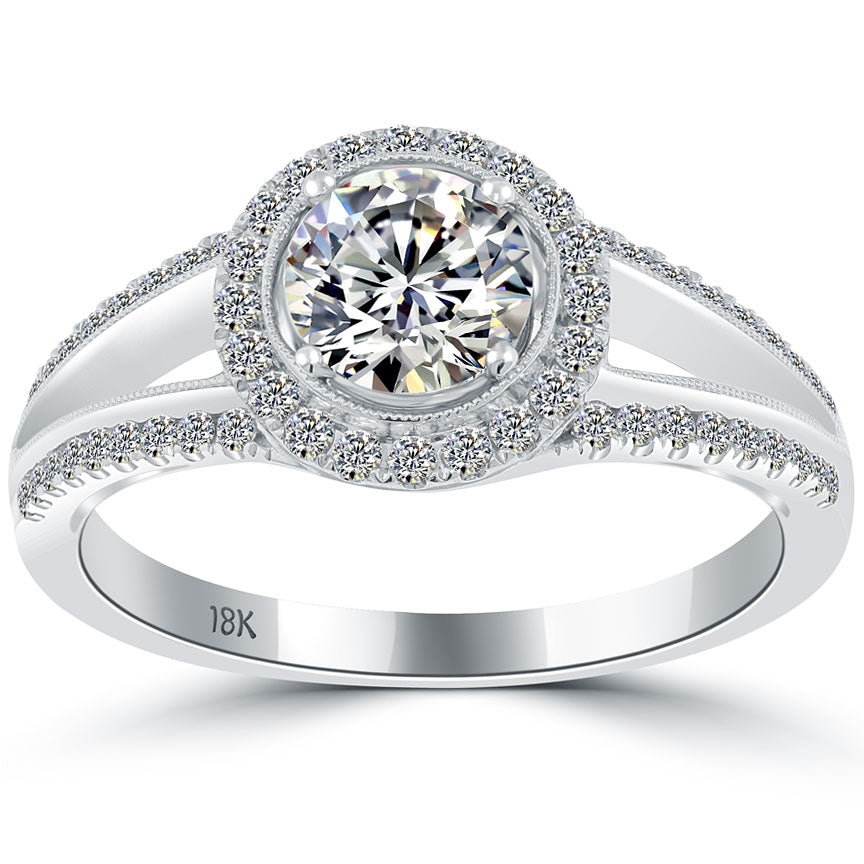 This elegant, classy and traditional round diamond engagement ring is set perfectly with a 0.86ctw round brilliant center diamond that is accompanied by 0.50ctw of F-VS round brilliant side diamonds. The center diamond is secured in a prong setting. A pave halo of round side diamonds is set surrounding the center diamond, adding to its brilliance and fire. Two rows of round brilliant side diamonds are set beautifully along the elegant split shank band of this ring. Intricate vintage style designs are etched on both surfaces of the ring. This diamond engagement ring is made in 18k white gold.