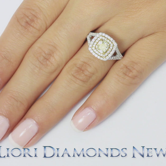 This unique diamond engagement ring is perfectly set up with a 0.73 ctw natural fancy yellow cushion cut center diamond and 0.65 ctw of gorgeous white F-VS round brilliant side diamonds. This diamond engagement ring is complimented by small round diamonds that are set in a micro pave setting along the band and around the center diamond in a pave halo design. This beautiful fancy color diamond engagement ring is made in 18k white and yellow gold.