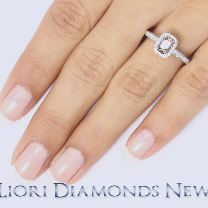 This fancy diamond ring is set with a 1.01 ctw Fancy Chocolate Brown Radiant cut center diamond and 0.40 ctw of white F-VS round brilliant side diamonds. The white round brilliant diamonds are set along the band and around the center diamond, in a pave halo design. The center stone is set in a prong setting. The round side diamonds are set in a micro pave setting. This fancy color diamond engagement ring is made in 18k white gold.