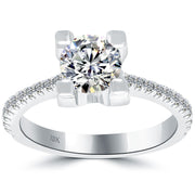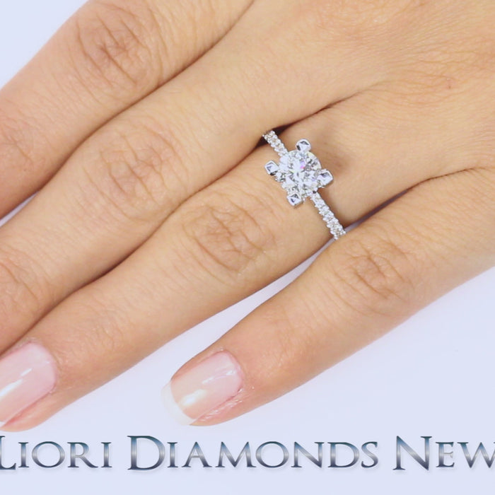 This dazzling ladies diamond engagement ring is set perfectly with a stunning 1.13 ctw round brilliant center diamond. A unique white gold basket design supports the center stone is a securing prong setting. 0.30 ctw of small round brilliant side diamonds are set in a single row along the elegant band of the ring, in a micro pave setting. This round diamond engagement ring is made in 18k white gold.