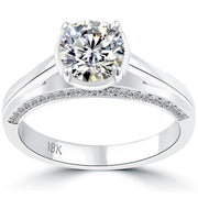 A traditional elegant and classy solitaire diamond engagement ring that is set with a 1.18 ctw F-SI1 round brilliant center diamond. 0.26 ctw of F-VS round brilliant diamonds are set on both surfaces of the band. The round brilliant center diamond is secure by four accompanying prongs. This round diamond engagement ring is made in 18k white gold.